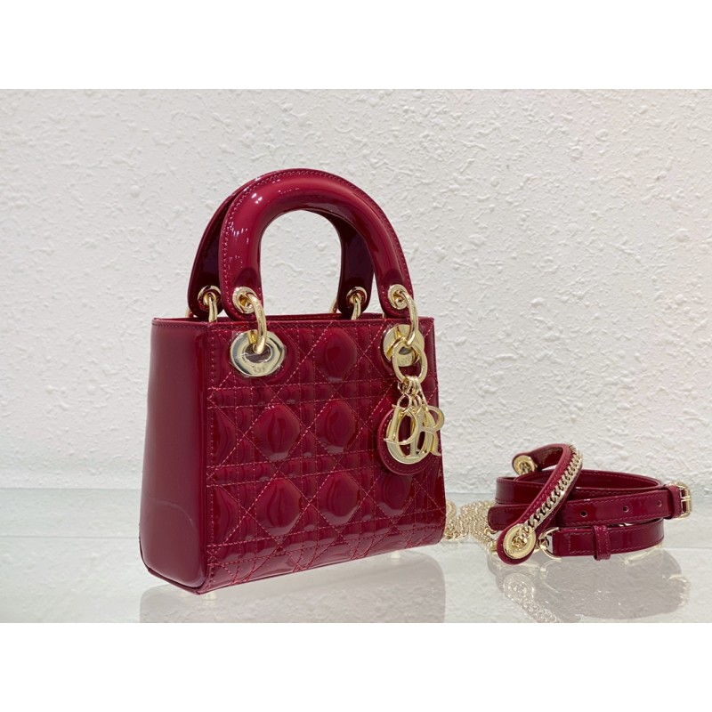 Dior LADY Three Grid Cherry Red Lacquer Leather Handbag